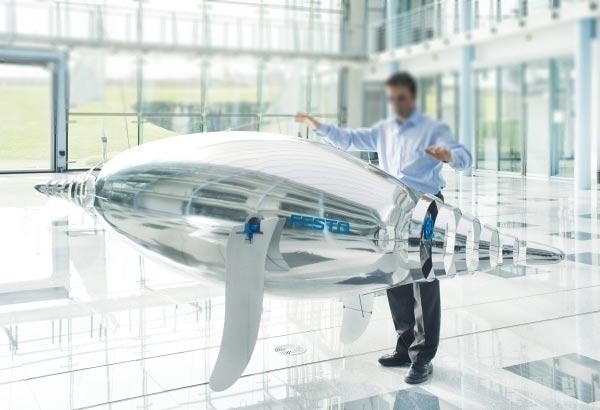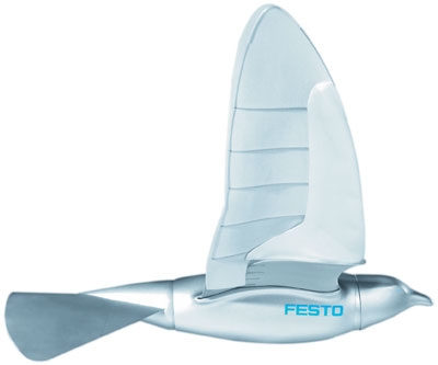 Propulsion is achieved by a beating wing drive. The servo drive-controlled wing, which can move up and down, utilises the Fin Ray Effect® and is based on alternate pulling and pushing flanks connected via frames. When pressure is exerted on one edge, the geometrical structure automatically curves against the direction of the influencing force. A servo drive pulls the two flanks alternately in longitudinal direction, thus moving the wing up and down.