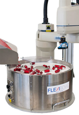 The SCARA robot is a manipulator with four degrees of freedom. This type of robot has been developed to improve the speed and repeatability ON PICK&PLACE TASKS from one location to another or to speed and improve the steps involved in assembly. This is why it is often used with FlexiBowl®. Morover these robots are used in the automotive field, as well as electronic, and other industrial fields where manufacturers needs to feed bulk components of all sizes; in these areas FlexiBowl® is performing so good that is replacing others parts feeders. SCARA kinematics makes this robot particularly suitable to perform assembly tasks with tight tolerances, such as putting a shaft into a hole, thanks to the capability to adjust the movement on the horizontal plane, while at the same time maintaining high rigidity on the vertical direction. The mechanics of the SCARA arm is generally quite strong and can withstand without problems unexpected stress and collisions. In a SCARA robot junctions of the shoulder and elbow are vertical and the wrist moves vertically. This configuration minimizes the effects of gravity on the robot by downloading them to the ground and allowing the use of this machine in cases of strong pressures as in vertical perforations.