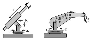 The spherical robots' structure is the one you can see at the left side of this picture. As you can see, it has two rotary joints and one linear. Thus a spherical work envelope is formed. Of course, it is not a sphere, but reachable places can still be calculated in a polar coordinate system. As you can understand, there can be more than three joints. However, these three are the basic ones that form the work envelope. Further joints would add more flexibility, but wouldn't radically change the reachable area. For example, if the gripper could rotate, this would be a 4-axis robot while the work envelope wouldn't change at all. A robot with an R-R-R structure with three rotary joints can be seen at the right side of the above picture. As you understand, robots of this kind have a near-spherical work envelope. Most modern industrial robots are derivatives of this type.