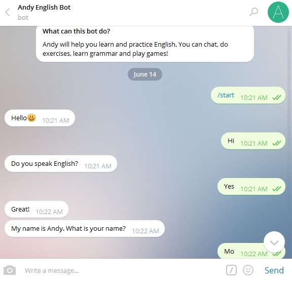 ربات تلگرام Andy، دوست صمیمی است که در محیط تلگرام به شما زبان انگلیسی را آموزش میدهد. یادگیری زبان از طریق انجام مکالمات، پاسخگویی به سوالات، تعریف کردن لطیفه و یا حتی بازی کردن با او خالی از لطف نخواهد بود. او، رباتی جوان و با ذوق است، از همین رو در صورتی که حرفی زد که باب میل شما نبود، به دل نگیرید.