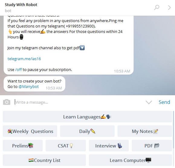 این ربات تلگرام، در واقع آچار فرانسهای در خصوص آموزش مطالب مختلف به کاربران است. امکان استفاده از سرویسهای مرتبط با فایلهای پیدیاف، آزمون سنجش هوش، یادگیری زبان، فراگرفتن روشهای مصاحبه، آزمون IAS، تاریخ جهان، جغرافیا و علوم موضوعاتی است که این ربات از آنها پشتیبانی میکند.