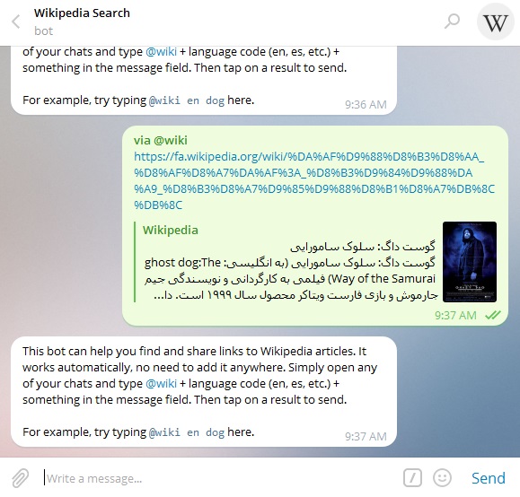 جستجو در ویکیپدیا: این ربات تلگرام، انواع مقالات در زمینه‌های مختلف را سرچ کرده و شما می‌توانید آنها را مطالعه کرده یا به اشتراک بگذارید. هرآنچه که در ویکی‌پدیا موجود باشد را می‌توانید در تلگرام خود پیدا نموده، بدون آنکه نیازی به اتصال در سایت ویکی‌پدیا داشته باشید.