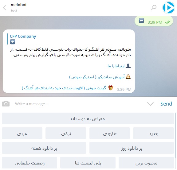 دانلود آهنگ: این ربات تلگرام، قادر است تا هر آهنگ دلخواهی را که مدنظر خود دارید، برای شما پیدا نموده و اجرا نماید. کافیست دستورات مربوطه را که در منوی این ربات آمده، کلیک نمایید و منتظر درخواست خود باشید. دارای دستهبندیهای مختلفی اعم از: جدید، خارجی، ترکی و عربی است.