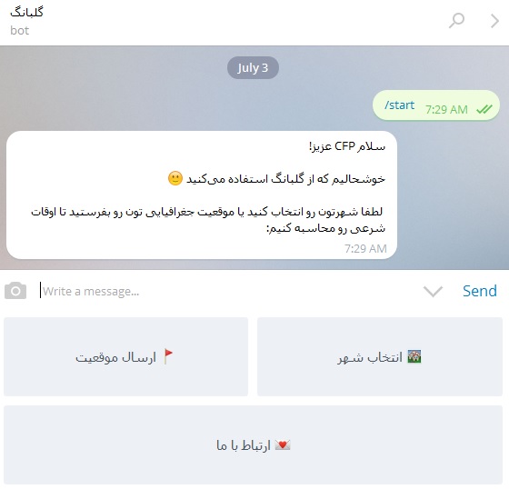 تلگرام, ربات تلگرام, ربات تلگرام اوقات شرعی, اوقات شرعی, اعلام اوقات شرعی, cfp
