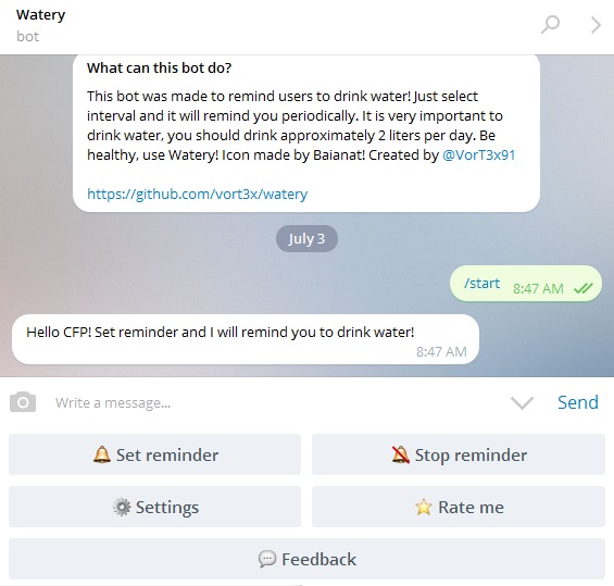 همه ما میدانیم که نوشیدن آب برای بدن بسیار ضروری است و روزانه براساس وزن خود باید حدود 2 لیتر آب بنوشیم. ربات تلگرامی جالب Watery، برای یادآوری نوشیدن آب به کاربران طراحی شده است. برای استفاده از ربات کافی است فاصله زمانی موردنظر خود را انتخاب کنید تا ربات در زمان مشخص شده به شما یادآوری کند.
