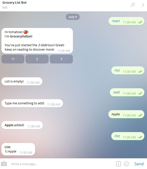 با استفاده از ربات تلگرام Grocerylist، می‌توانید به راحتی لیست خرید خود را مدیریت کنید و آن را با خانواده و دوستان خود در تلگرام به اشتراک بگذارید. از این ربات تلگرام می‌توانید حتی در گروه‌های چت استفاده کنید.