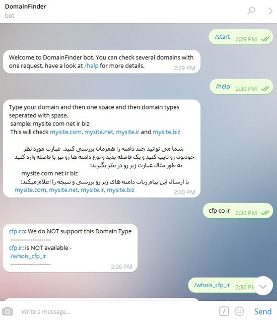 این ربات تلگرام به شما کمک میکند بدون صرف وقت زیاد بررسی کنید نام دامنه مدنظر شما قابل ثبت هست یا خیر. به طور مثال، میتوانیم دستور روبرو را تایپ کرده و برای ربات ارسال کنیم: cfp co ir. اینجا منظور ما این هست که ربات بررسی کند آیا امکان ثبت دامنه با آدرس cfp.co.ir وجود دارد یا خیر. ربات در پاسخ به شما جواب خواهد داد که کدام دامنهها را میتوانید ثبت کنید.