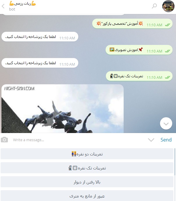 با استفاده از این ربات تلگرام میتوانید تمام آموزشهای فنون رزمی را در قالب عکس دریافت نمایید. برای مثال در قسمت پارکور شما قادر خواهید بود تا از تاریخچه آن اطلاع حاصل نموده و تمرینات تکنفره، دونفره و ... را مشاهده بفرمایید.