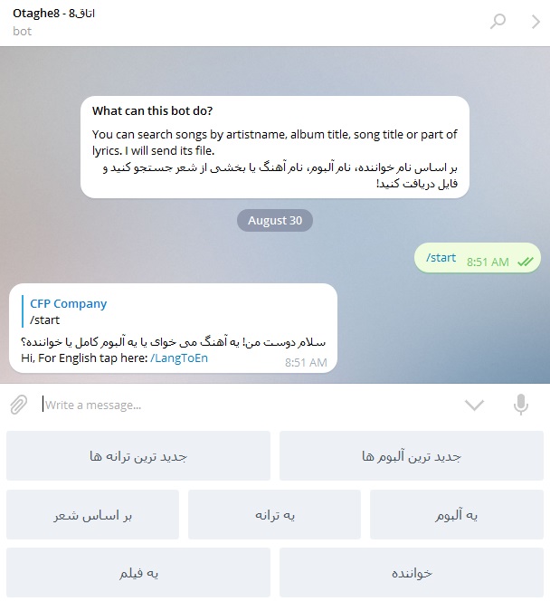 اگر شما هم علاقهمند هستید از جدیدترین آلبومها و موزیکهای منتشر شده مطلع شوید و یا آلبومهای خواننده موردعلاقه خود را دانلود کنید، جای نگرانی نیست. این ربات تلگرام این کار را برای شما ساده کرده است. با ورود به این ربات و تایپ عبارت Start/ میتوانید از قابلیتهای آن آگاهی پیدا کنید. استفاده از این ربات تلگرام را به تمامی طرفداران موسیقی پیشنهاد میکنیم زیرا جذاب و ساده بوده و دارای قابلیت اضافه شدن به گروه را نیز دارد.