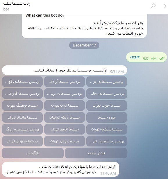 ربات تلگرام: خرید بلیت فیلم از سینماتیکت