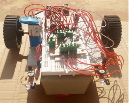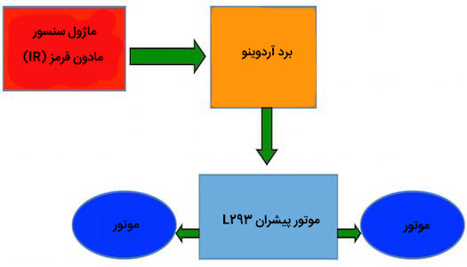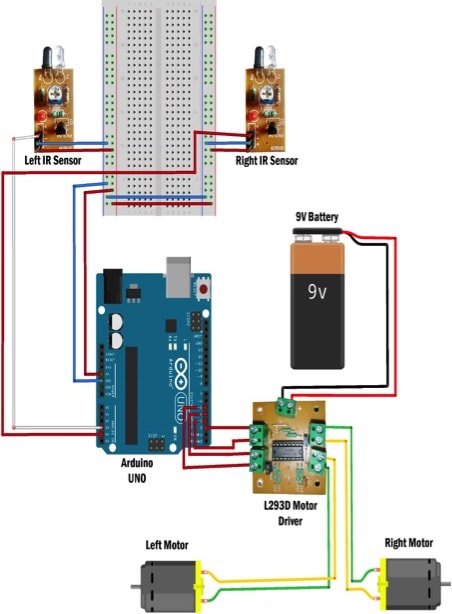 IC کنترلر موتور L293D برای کنترل دو موتور استفاده می شود. از یک موتور پیشران استفاده می شود زیرا آردوینو نمی تواند جریان کافی برای موتور پیشران فراهم کند. پین 2، 3، 4، و 5 در Arduino وارد ورودی L293D IC می شود. پین 2 و 3 سیگنال های کنترل برای موتور راست است و 4 و 5 سیگنال های کنترل برای موتور چپ است. باتری 9 ولت به موتور L293D متصل میشود. + 5V و GND به هر دو سنسور IR از Arduino داده می شود. خروجی های حسگر IR سمت چپ و راست به ترتیب به پین 3 و 4 آنالوگ بر روی Arduino اعمال می شود. خواندن از حسگر IR دارای مقادیر آنالوگ خواهد بود. به عنوان یک مانع مانع از سنسور، مقدار آنالوگ خروجی DOWN دیجیتال خواهد بود. خروجی از موتور پیشران (L293D) به دو موتوری که در نمودار دیده می شود، اتصال مییابد.
