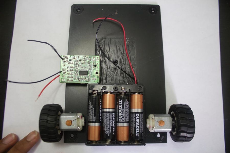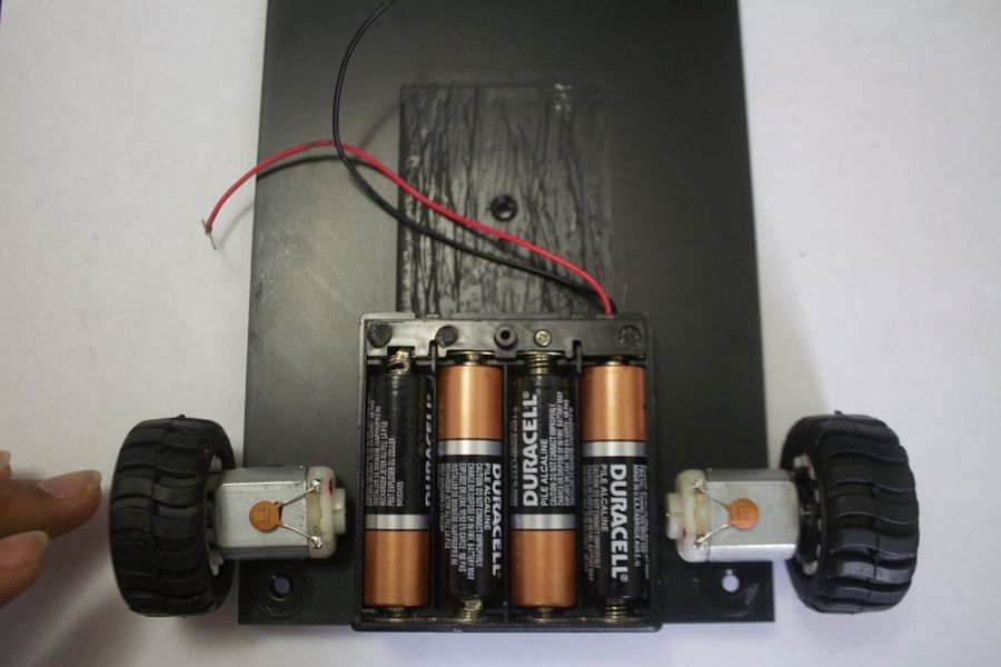 گام چهارم: الحاق مدار پیشران موتور: مدار پیشران موتور را در امتداد یک طرف شاسی قرار دهید، طوریکه سیمها را بر روی لبه قرار دهید.
