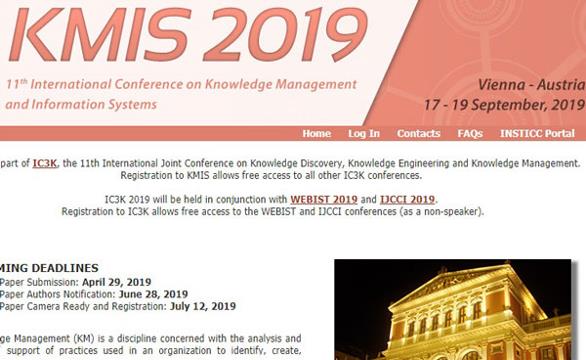 یازدهمین کنفرانس بین‌المللی مدیریت دانش و سیستم‌های اطلاعاتی KMIS 2019 یک رشته مربوط به تجزیه و تحلیل و پشتیبانی فنی از شیوه‌های استفاده شده در یک سازمان برای شناسایی، ایجاد، نمایندگی، توزیع و فعال کردن پذیرش و بهره‌برداری از شیوه‌های خوب تعبیه شده در تنظیمات همکاری و به ویژه در فرایندهای سازمانی است. مدیریت دانش موثر منبع مهم و فزاینده‌ای از مزیت رقابتی و کلید موفقیت سازمان‌های معاصر، تقویت مهارت جمعی کارکنان و شرکای آن است.