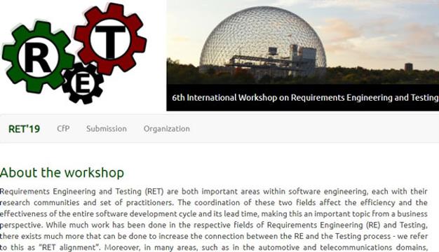 ششمین ورکشاپ بینالمللی مهندسی و تستهای موردنیاز RET 2019 یک ورکشاپ بینالمللی برای تبادل ایدهها و شیوهها برای هماهنگی مهندسی و تستهای موردنیاز بوده که کمک میکند تا توسعه و همکاری بین صنعت و دانشگاه ایجاد گردد. این ورکشاپ تعامل شرکتکنندگان را از طریق جلسات "اشعه ایکس" تشریح میکند که برای تسهیل گفتگو بین مخاطبان ورکشاپ و ارائهدهندگان از طریق ابزار، نظرسنجیها، آموزشها و بحثهای تعاملی طراحی شده است.
