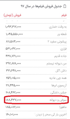 میزان فروش فیلم سوفی و دیوانه (تا تاریخ 2 آبان 1397)
