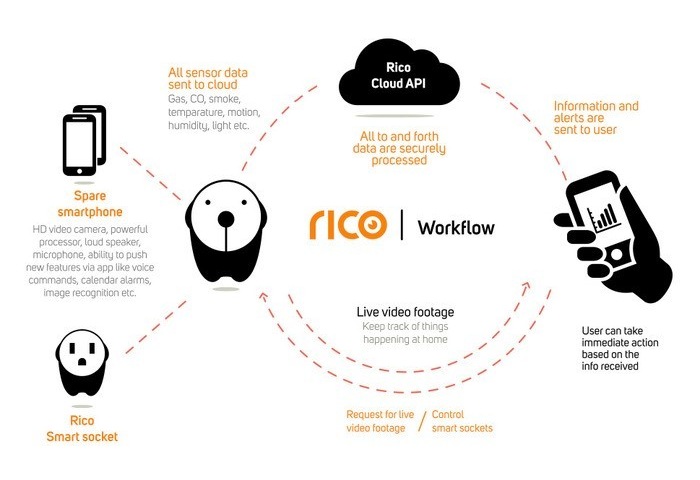 ربات Rico یک ربات نگهبان بوده که با استفاده از گوشی‌های قدیمی قادر به نظارت در خانه است؛ با اینکه اکثر مردم از گوشی‌های هوشمند استفاده می‌کنند اما ریکو با گوشی قدیمی کار می‌کند. این ربات قادر است مانند گوشی‌های هوشمند فیلمبرداری کند، عکس بگیرد و ضبط کند، ضمن اینکه قادر به پخش موسیقی است و از طریق WIFI به 3G متصل می‌شود تا کاربر از راه دور بتواند از طریق گوشی هوشمند، بر خانه نظارت کند. این ربات بدون تلفن کار می‌کند و دارای سنسورهایی برای نظارت بر تحرکات مشکوک در منزل است، همچنین می‌تواند درجه حرارت و دود را کنترل کند و لوازم خانگی را از راه دور خاموش کند.