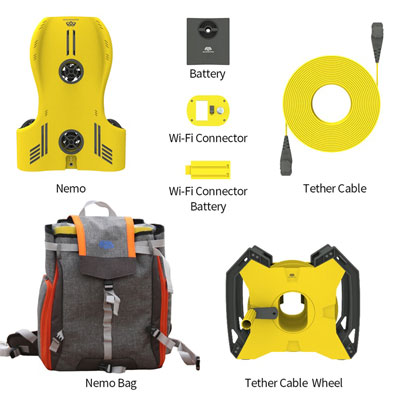 ربات Nemo یک ربات زیرآبی هوشمند بوده که با داشتن دوربین UHD 4K به شما امکان مشاهده تمام اقدامات روی گوشی هوشمند خود و یا استفاده از عینک واقعیت مجازی (VR) را میدهد. ربات Nemo شامل 4 انگشت شمار، 50 درجه ارتقاء آزادی و 360 درجه حرکت است. همچنین با چراغ های LED برای فیلمهای با کیفیت بالا زیر آب میتوان بکار برد. همچنین دارای باتری قابل تعویض میباشد.
