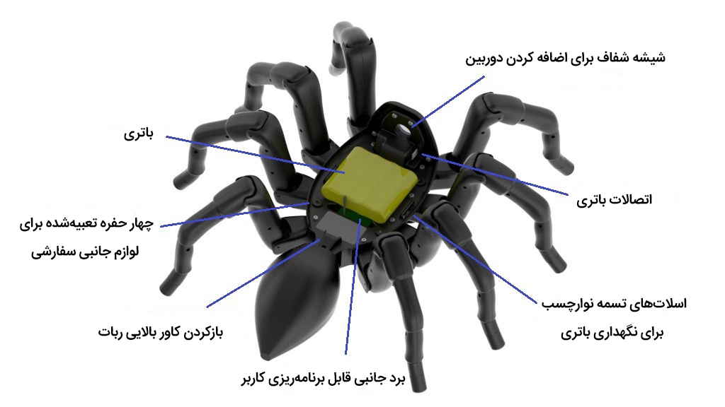 این ربات، بدنه آن توسط چاپگر سه بعدی تولید شده و با ۲۶ موتور داخلی کار میکند. سازندگان، آن را به گونهای ساختهاند که حرکاتش بسیار به یک عنکبوت واقعی شبیه است و جالب اینجاست که محاسبات اصلی برای تعیین مشخصات حرکات توسط سیستم درونی خود عنکبوت انجام میشود. ویژگی جالب این ربات، در حرکات بسیار طبیعی و روان آن است. بدنه خارجی آن توسط نرمافزارهای CAD طراحی شده و به کمک یک چاپگر سه بعدی پرینت شده است. بدیهی است که استفاده از این روش و چاپ سه بعدی بسیار هزینهبر و وقتگیر است؛ نتیجه مشخص این روش نیز ایجاد گلوگاه در خط تولید خواهد بود. دلیل اصلی مشکل در تأمین سفارشات نیز همین مورد است. بنابراین شرکت سازنده در نسخهی T8X تصمیم به استفاده از روش تولید قالبگیری تزریقی برای تولید اسکلت خارجی ربات گرفته است و همین روش علت اصلی این کاهش قیمت به شمار میرود. به علاوه این ربات جدید از امکانات بیسیم، حسگر لمسی و سامانه شارژ جدیدی بهره میبرد.