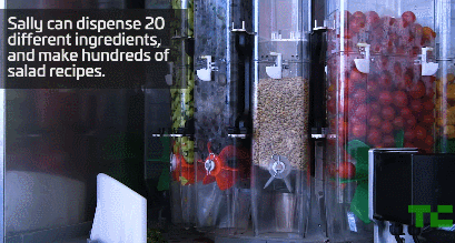 سالاد به عنوان غذایی سالم و تازه شناخته میشود؛ اما به دلیل مواد فراوانی که در تهیه آن استفاده میشود، تهیه آن زمانبر است؛ از سوی دیگر، مصرف سالادی که با مواد تازه طعم دلنشینی خواهد داشت. از طرفی، بسیاری از مؤسسات، بودجهای برای استخدام آشپزی که انواع سالادهای خوشمزه و تازه را تهیه کند، اختصاص نمیدهند. ربات سالادساز Sally از بیش از 21 نوع ماده فصلی برای تولید انواع سالاد استفاده میکند که در زیر یک دقیقه سالاد مورد نظر مشتری را در اختیار او قرار میدهد. در داخل این دستگاه رباتیک، محفظههای سبز، سفید و مات قرار میگیرد که مواد تازه تهیه سالاد مانند کاهو، پیاز خرد شده، گوجهفرنگی و زیتون داخل آنها ریخته میشود که به عنوان ماده اصلی یا پوشش تزئینی سالاد مورد استفاده قرار میگیرند. مشتریها، کاسهای را در محل مورد نظری که برای ریختن سالاد تعبیه شده است، قرار میدهند و سپس با استفاده از صفحه نمایشگر لمسی دستگاه، از منوی تهیه شده، سالاد و مواد مورد علاقه خود را انتخاب میکنند. آنگاه ربات Sally به طور هوشمند، مواد انتخاب شده را یکی پس از دیگری انتخاب میکند و پس از ریختن داخل کاسه، آماده سرو است.