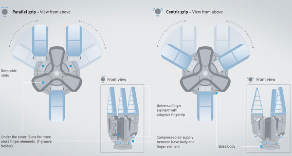 ربات MultiChoiceGripper یک بازوی رباتیک هوشمند بوده که گیره پنوماتیک آن از دست انسان الهام گرفته شده است و بر روی انگشت شست مدل شده است؛ به همین دلیل انسان نیز قادر به گرفتن سریع و راحت انواع مختلفی از اشیا است. لذا انگشتان دست خود را میتوان تغییر داد تا آنها بتوانند به صورت موازی با محور بدون نیاز به هیچگونه تبدیل، تنظیم شوند.