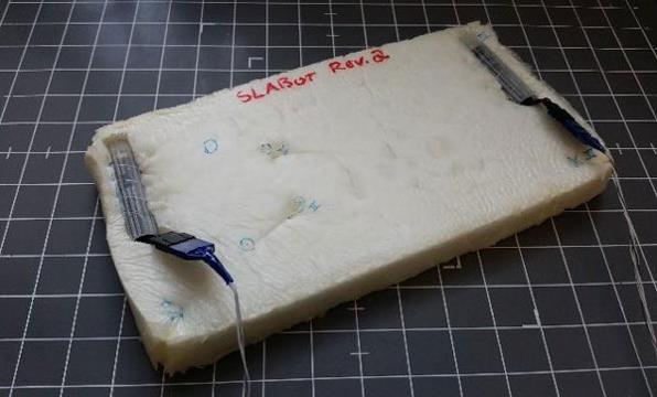 ربات SLABot یک نرم ربات هوشمند بوده که از یک اسلب ریختهگری، باز سلولی و پلی اورتان ساخته شده است. موتورهای تاندون در یک جهت مشخص برای حرکت رو به جلو اقدام میکنند. تاندونها از طریق اسلب فوم پیوند داده شده و در هنگام جاگذاری، فشردهسازی و با سطوح اصطکاک، دیفرانسیل افقی را نشان میدهند. ربات SLABot قادر به حرکت مؤثر با ترمیم تاندونهای غیرمترقبه بوده که توانایی کنترل تفکیک شدهای از حالتهای گیربکس و طبیعت خطی کاملا پلاستیکی، فوم بسیار منعطفی را دارد.