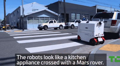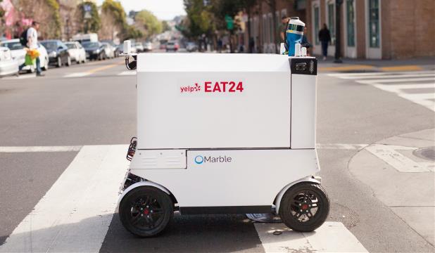 قوانین حاکم بر استفاده از رباتهای تحویل غذا در سراسر ایالات متحده دیده میشود؛ اما کسب و کارهای بزرگ مواد غذایی در حال بررسی احتمالات هستند. در آخرین معامله، YelpEat24 آزمایش تحویل مواد غذایی توسط رباتها را با همکاری شرکت Marble در یک محله سانفرانسیسکو آغاز کرده است. این شرکت یکی از تعداد انگشتشمار سرمایه گذارها در توسعه رباتهای زمینی است. رباتهایی که میتوانند به صورت مستقل به آدرس مشتری حرکت است. ماشین آلات Marble ظاهری همچون لوازم بزرگ آشپزخانه دارد و شبیه کاوشگر مریخ حرکت میکند. کاربران به طور معمول توسط تارنمای Yelp Eat24 یا برنامههای کاربردی سفارش خود را ثبت میکنند. از کاربران پرسیده میشود که آیا تحویل با ربات را انتخاب میکنند. اگر جواب آنها مثبت بود، یک رمز (پین کد) به تلفن همراه کاربران پیامک میشود. زمانی که ربات به محل رسید، کاربران از این کد برای باز کردن محموله ربات استفاده میکنند. کاربران پس از اینکه غذا را دریافت کردند درب ربات را میبندند و ربات به رستوران باز میگردد. مت دلانی (Matt Delaney)، مدیر عامل شرکت و یکی از مؤسسان این استارتآپ سانفرانسیسکویی (Marble) گفت: «ما با وعدههای غذایی آغاز کردیم، اما فکر میکنم ربات ما برای همه چیز از تحویل مواد غذایی تا دارو و تحویل پاکت در دراز مدت مفید باشد». دلانی افزود ربات Marble به گونهای طراحی شده تا در یک محیط شهری خوش رفتار و فروتن باشد. ربات Marble به کمک لیدارها، دوربین و حسگرهای فراصوت و همچنین ابررایانه هوش مصنوعی Jetson TX1 انویدیا، محیط اطراف خود را درک میکند. این رباتها با استفاده از نقشههای سه بعدی و با وضوح بالا از پیادهروها، ساختمانها و بیشتر محلههایی که شرکت خدمات خود را ارائه میدهد، میتوانند در روز و هم در شب فعالیت داشته باشند.