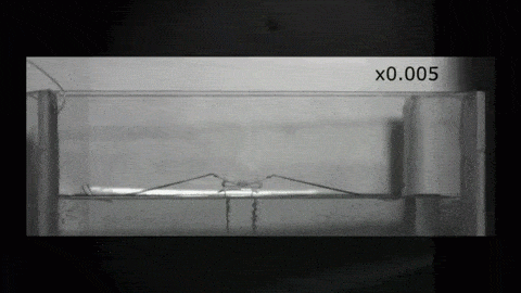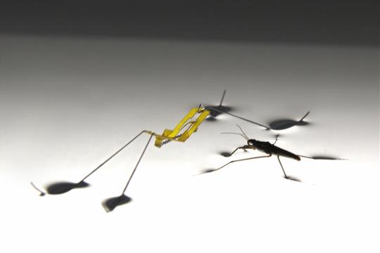 ربات Water Strider میتواند روی آب راه برود و حتی بپرد و دارای یک مکانیسم الهام گرفته از حشرات بوده که میتواند حتی بدون ایجاد صدای چلپچلوپ آب، بر روی یک سطح مایع ایستاده و بپرد. با ایجاد پاهایی که بالای آن اندکی خم شده و یک طراحی مبتنی بر حرکت حشرات آبپیما، این تیم موفق به ایجاد یک ربات شده است که قادر است نیرویی معادل ۱۶ برابر وزن بدن خود را ایجاد کرده و هیچگونه اختلالی در سطح آب ایجاد نکند.