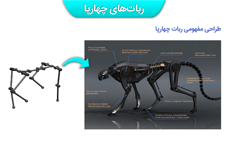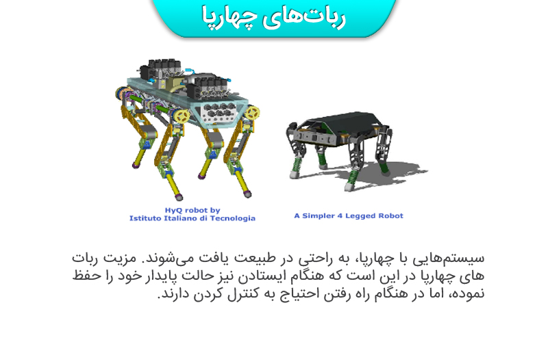 سیستمهایی با چهارپا، به راحتی در طبیعت یافت میشوند. مزیت رباتهای چهارپا در این است که هنگام ایستادن نیز حالت پایدار خود را حفظ نموده، اما در هنگام راه رفتن احتیاج به کنترل کردن دارند. راههای مختلف زیادی برای این رباتها وجود دارد. در حال حاضر، این تکنیکها متوقف شده و نیاز به کنترل دینامیکی دارند.