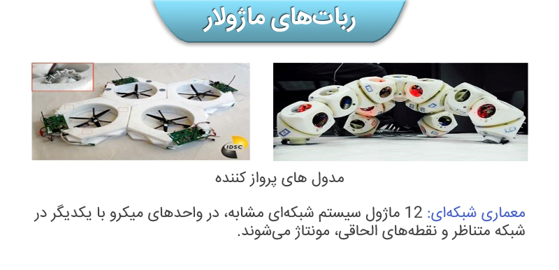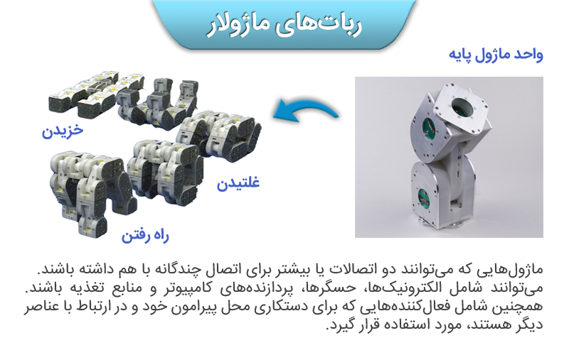 واحد ماژول پایه: ماژولهایی که میتوانند دو اتصالات یا بیشتر برای اتصال چندگانه با هم داشته باشند. میتوانند شامل الکترونیکها، حسگرها، پردازندههای کامپیوتر و منابع تغذیه باشند. همچنین شامل فعالکنندههایی که برای دستکاری محل پیرامون خود و در ارتباط با عناصر دیگر هستند، مورد استفاده قرار گیرد.