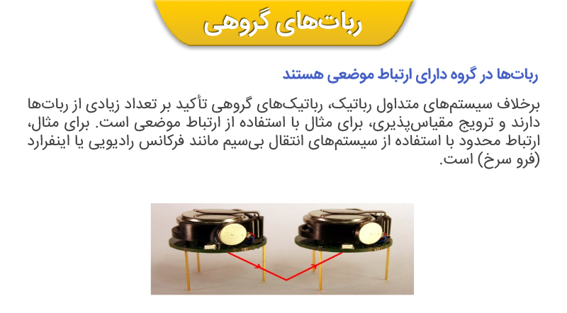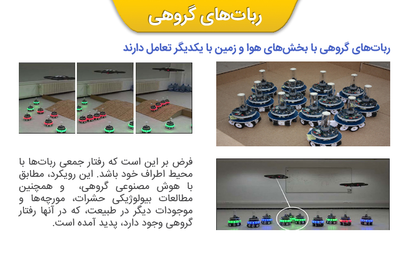 رباتیک گروهی چیست؟ رباتهایی هستند که مفید بوده و چند کار را با همدیگر برای یک وظیفه همگانی انجام میدهند. بسیاری از کاربردهای مفید این رباتها، علیالخصوص برای رویکرد گروهی، مناسب هستند. گروههایی از رباتها میتوانند این وظایف را نسبت به رباتهایی که به صورت انفرادی کار میکنند، موثرتر انجام دهند. رباتیک گروهی با بخشهای هوا و زمین با یکدیگر تعامل دارند.
